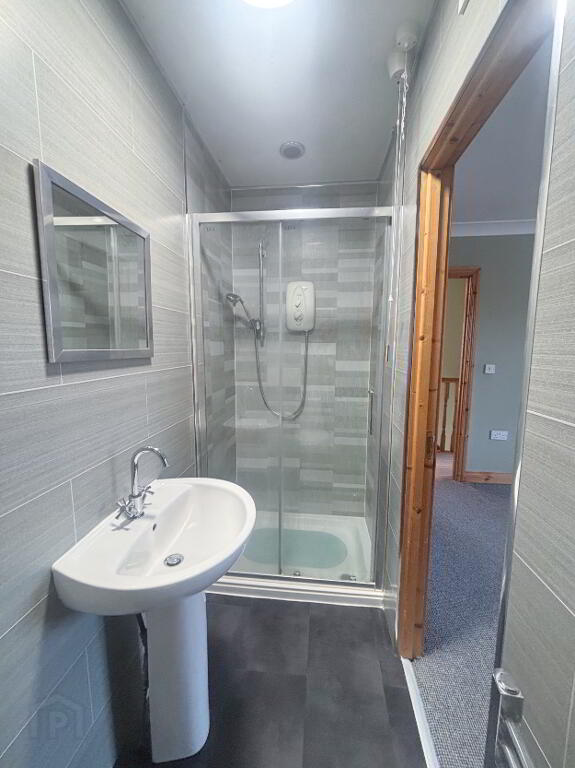 Tiled flooring, three-piece white suite with a walk in electric shower with grey modern panelling and remaining en-suite is grey tiled, a low flush WC and white hand basin and pedestal.